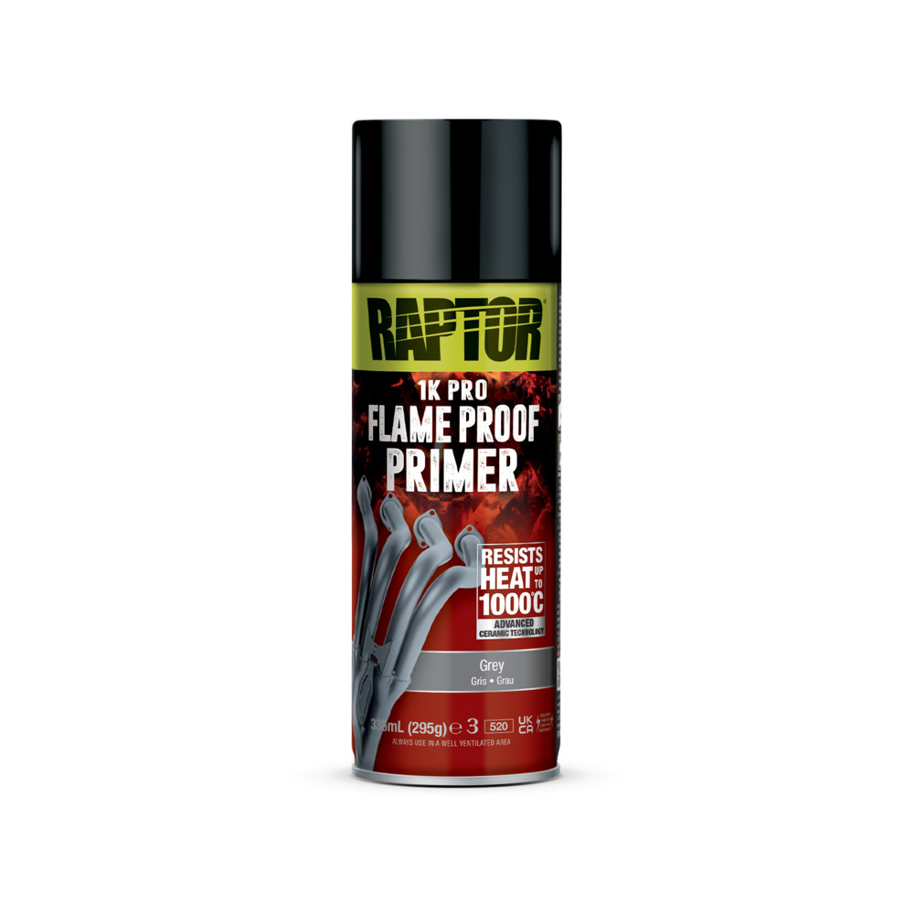 A professional quality primer for use prior to the application of RAPTOR Flame Proof. Ideal for use on exhaust manifolds, headers, exhaust systems and other areas that require protection from very high heat. RAPTOR Flameproof Primer uses advanced ceramic technology that withstands temperatures up to 1000°C. When fully cured and used in combination with RAPTOR Flameproof, it provides a finish which is 5x tougher than ordinary paints* with superior protection from heat, oil and other automotive fluids. It’s easy to use and dries fast with excellent adhesion. Suitable for use on all types of metals including steel, aluminium, and alloys.